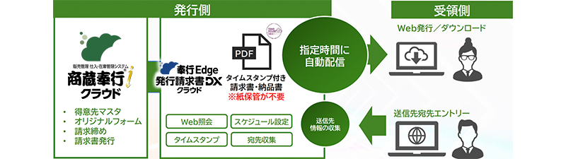 商蔵奉行iクラウドと奉行Edge 発行請求書DXクラウドを合わせて利用すると、商蔵奉行iクラウドで締め処理をすれば自動的に請求書をデータ化し、Web上で簡単に請求書データを発行することが可能です。発行時にタイムスタンプを自動付与するので、受領側の取引先でもそのまま改正電子帳簿保存法に対応できます。配信時間を指定して自動配信することもできるので、請求書の発行を忘れたり業務が滞ったりすることもなくなります。
