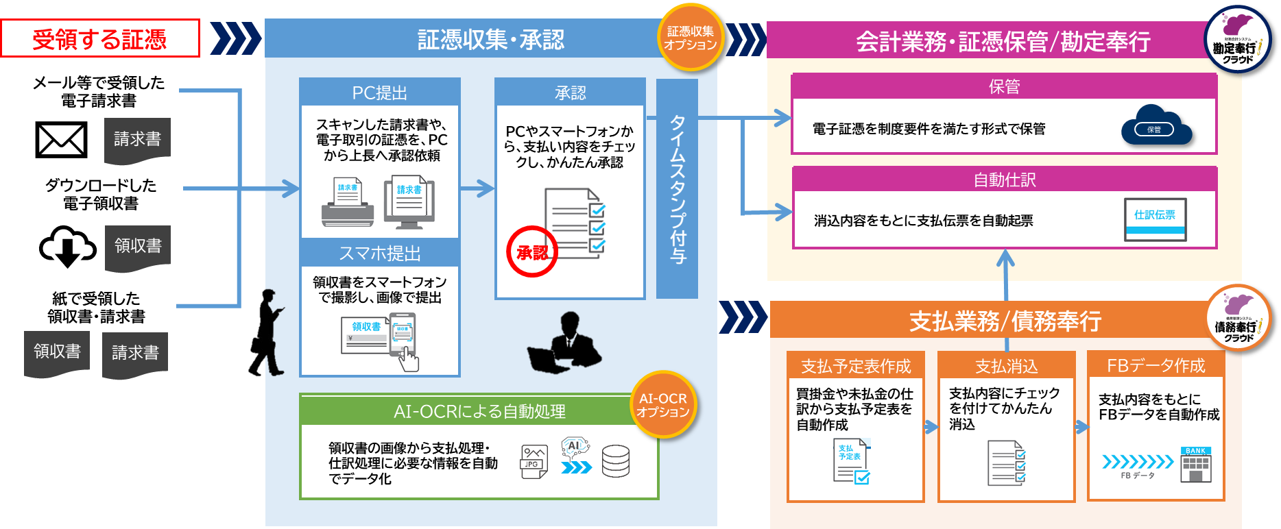 また、各部門からの提出・承認フローをデジタル化すれば、受領した紙の書類もデータで管理することができ、仕訳起票を自動化することもできるようになります。勘定奉行iクラウドなら、各拠点・従業員からの証憑収集から会計処理、支払業務までのフローを完全デジタル化でき、簡単に業務をデジタル化できます。つまり、勘定奉行iクラウドを活用すれば、会計業務のDX化とSDGsへの貢献を同時に実現することができます。