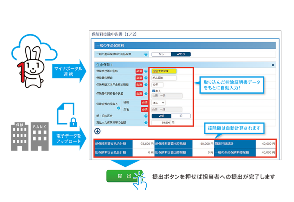 また、年に1回の年末調整業務も、申告書の記入をシステムに直接入力してもらえば、紙の申告書を提出する必要がなくなり、ペーパーレスに貢献することができるうえ、業務時間も労力も大幅に削減することが可能です。奉行Edge 年末調整申告書クラウドなら、マイナポータル連携で従業員から各種控除証明書などをデータで受け取ることもできるので、控除証明書内容の入力自体も不要になります。
