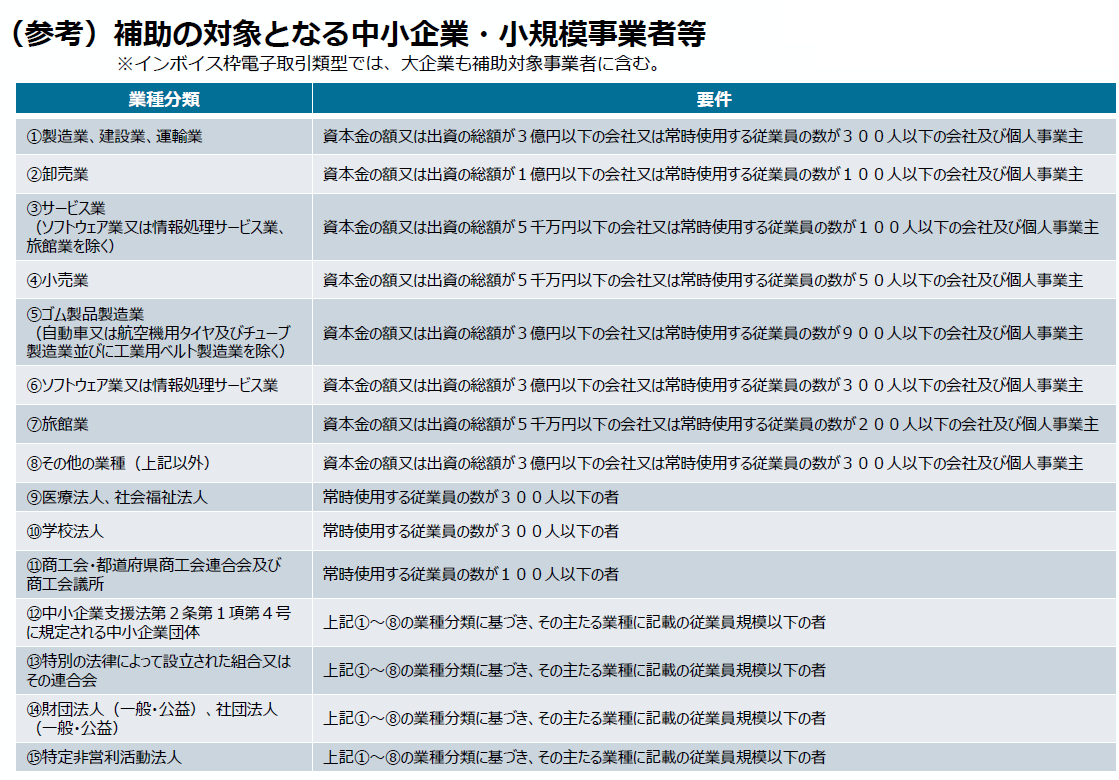 IT導入補助金制度は、中小企業・小規模事業者を支援するための補助金です。ここでいう「中小企業・小規模事業者」とは、次の要件を満たす場合となっています。