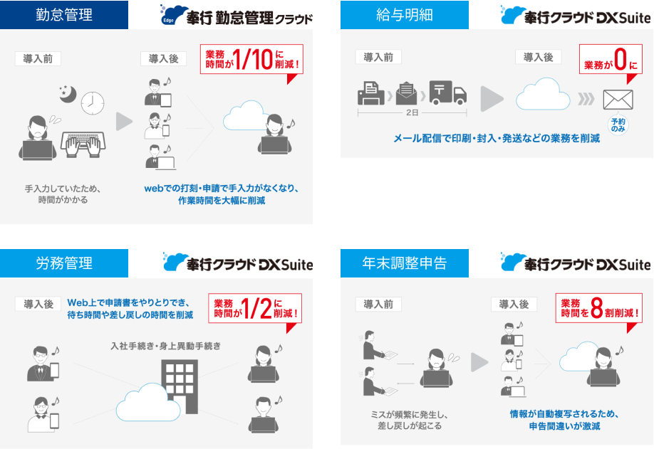 奉行シリーズだけで人事労務業務を完結でき、従業員にとっても使いやすいと感じ、「奉行クラウド」を導入しました。給与、人事管理のほか、勤怠管理、給与明細配付、労務管理、年末調整申告など網羅的に業務をDX化でき、スムーズな情報連携で業務を行えるようになりました。