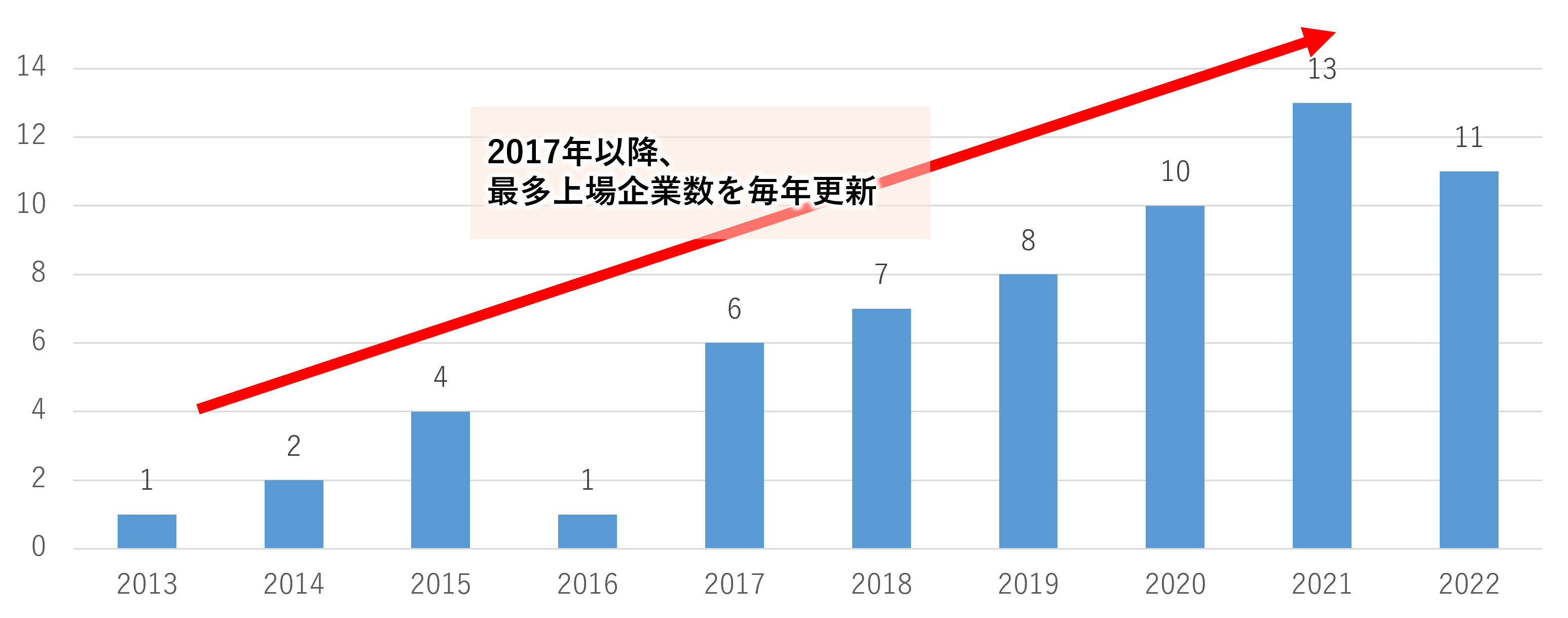 東京プロマーケットへの上場企業数は2022年上半期で11社に上り、2021年の上場企業数13社に並ぶ勢いです。今年も上場企業数最多を更新することは間違いないでしょう。