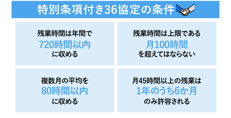 上限を超えて残業をさせる場合には、特別条項付きの36協定を締結し、労働基準監督署に届け出ることが必要です。そのうえで、次の条件をすべて満たさなければなりません。