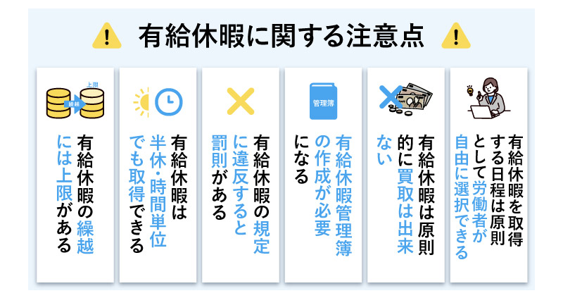 労働者の有給休暇取得に関しては、ほかにも注意すべき点があります。続いては、有給休暇を翌年以降に繰り越す場合の対応や、半休・時間単位の有給休暇の取り決めのほか、有給休暇の規定に違反した場合の罰則などについて解説しましょう。