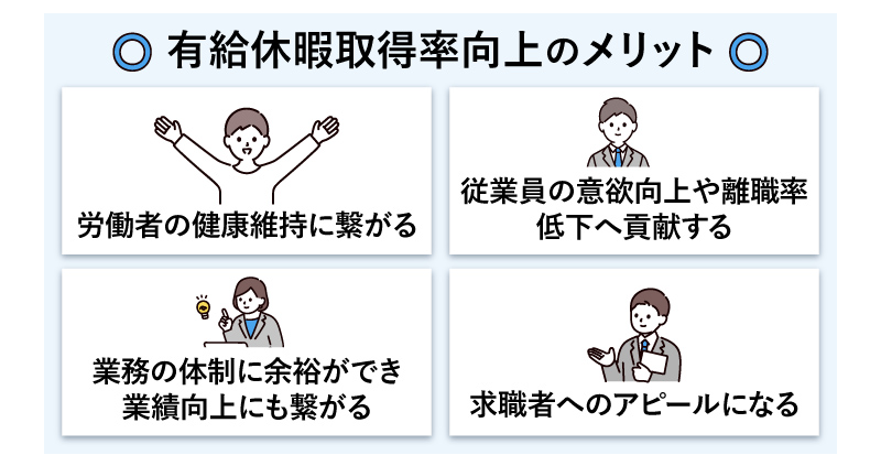また、常に仕事に取り組み続けるよりも、有給休暇を活用して定期的にリフレッシュしてもらったほうが、社員のモチベーションが上がって業務が円滑に回り、業績も向上する可能性があります。