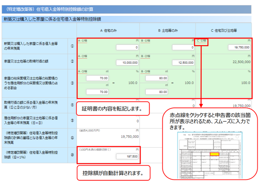 紙の申告書は、控除計算明細書も兼用となっており、最終的に控除される額の根拠となる計算も一緒に提出することになります。年末残高証明書の情報を転記し、注釈にある計算式に則って計算結果をまとめていくと、控除額が算出されるようになっています。