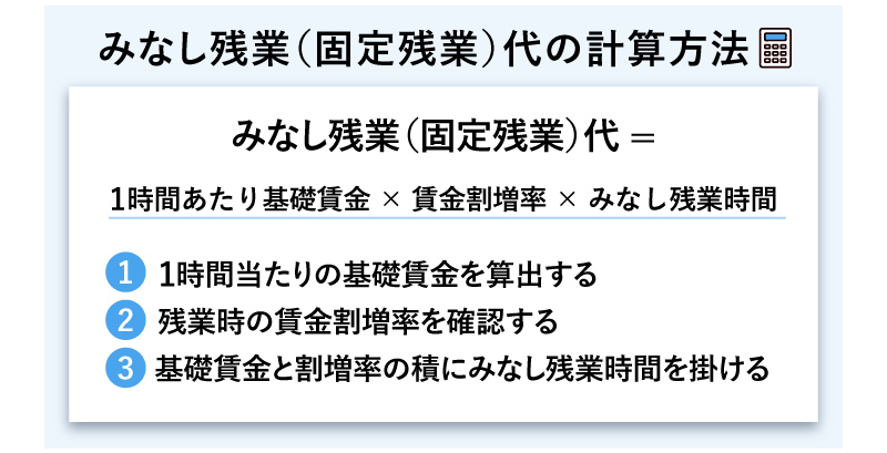 みなし残業(固定残業)代は、次の式で算出します。ここでは、基本的な計算方法のステップをご紹介します。