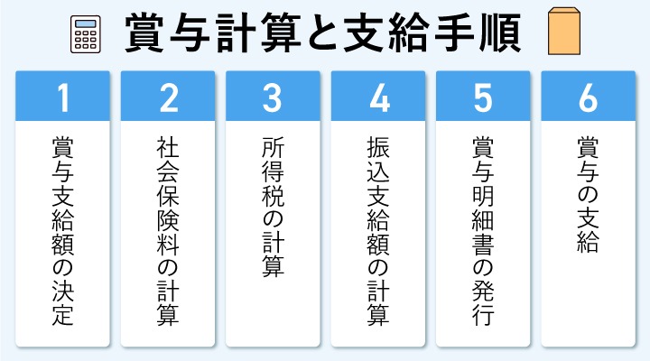 賞与の計算と支給手順については、6つのステップで進めます。それぞれのステップにおける、具体的な業務の進め方について見ていきましょう。