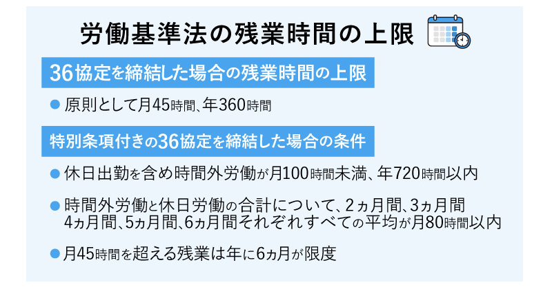 臨時的に限度時間を超えて残業を行わなければならない特別な事情がある場合は、「特別条項付きの36協定」を締結します。残業時間の条件は、下記のとおりです。