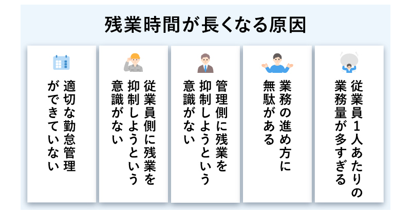 従業員数に対して、処理すべき業務量が過大であれば、残業時間が長くなってしまいます。業務効率化などの工夫では対応しきれない業務量であったり、そもそも目の前の業務が多すぎて効率化のための施策をとれなかったりすると、作業時間を増やして解決するしかありません。