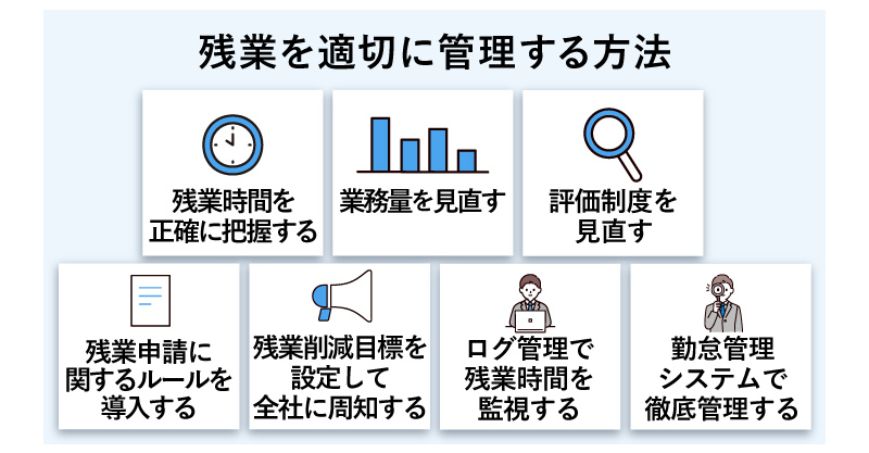 残業を適切に管理するためには、複数の施策が必要です。ここでは、残業管理のために行うべきことをご紹介します。