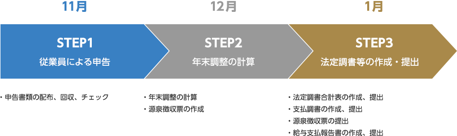 年末調整は、企業によってスタート時期が異なりますが、概ね11月頃からスタートし、1月下旬まで作業するのが一般的です。書類の数も多いため一見複雑そうに見えますが、次のように3つのステップで考えると、その流れは至ってシンプルです。