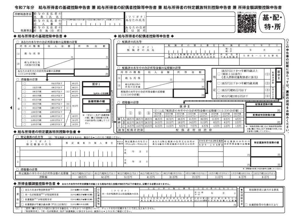 なお、紙の様式では、基礎控除申告書は配偶者控除等申告書や所得金額調整控除申告書、特定親族特別控除申告書とまとめて1枚になっています。