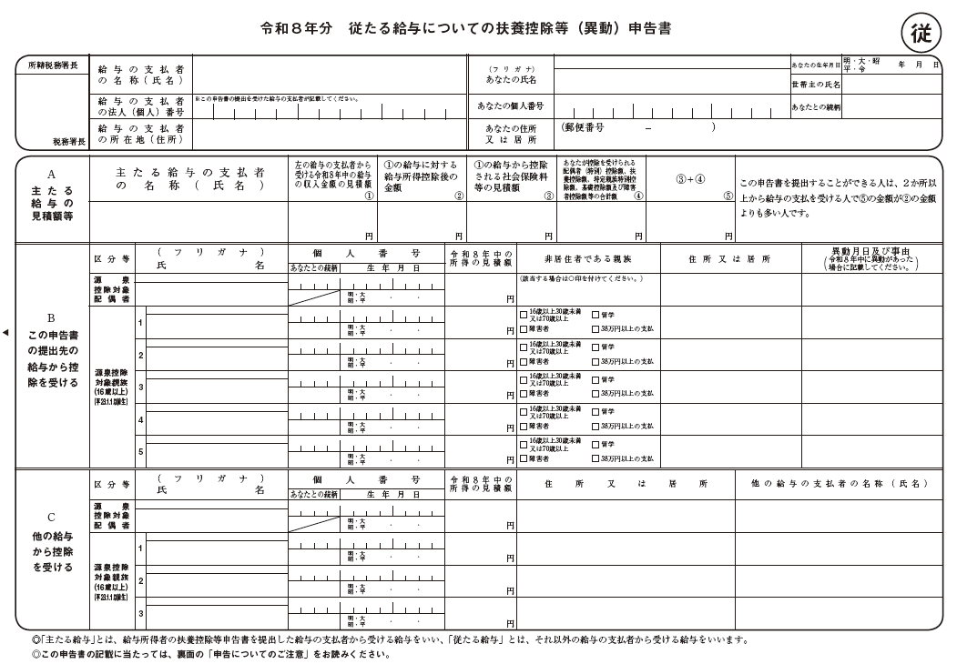 紙の様式では、基礎控除申告書や配偶者控除等申告書、特定親族特別控除申告書とまとめて1枚になっているものを使用します。(上記「基礎控除申告書」参照)