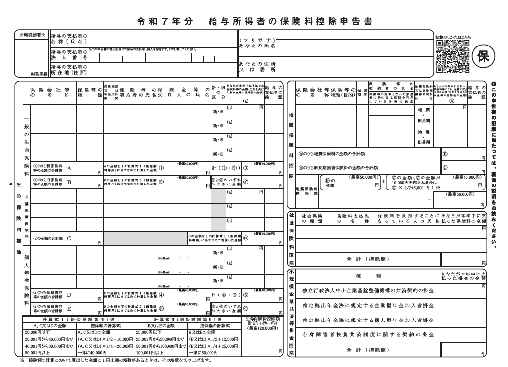 生命保険料や地震保険料などの保険料を支払った人が、保険料控除を受けるために必要な申告書です。