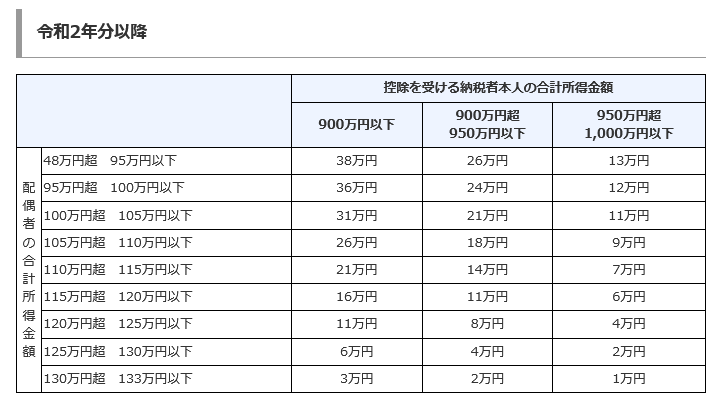 また配偶者特別控除は、従業員本人の合計所得金額が1,000万円以下の場合、配偶者の所得が58万円超〜133万円以下(給与収入のみなら123万円超〜201.6万円未満)であれば、従業員の所得に応じて段階的に適用されます。