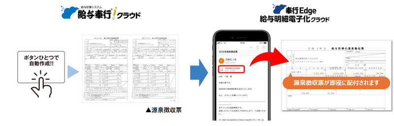 給与奉行iクラウドの場合、源泉徴収票もボタン1つで簡単に作成でき、奉行Edge 給与明細電子化クラウドをセットで利用すれば、そのまま電子発行することが可能です。