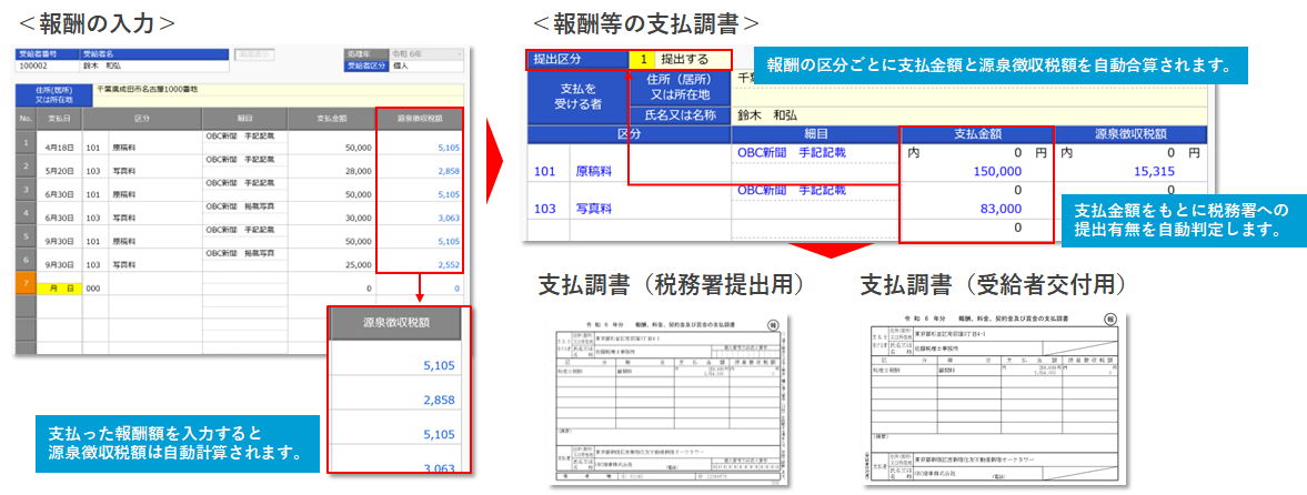 e-TaxやeLTAXを使った電子申告では、直接アクセスして手続きすることもできますが、昨今はe-TaxやeLTAXとAPI連携できる基幹システムもあります。例えば、法定調書奉行iクラウドの場合、年間の支払金額から支払調書の提出要否を自動判定し、提出が必要と判定された場合にのみ、支払調書のフォーマットで自動出力できます。