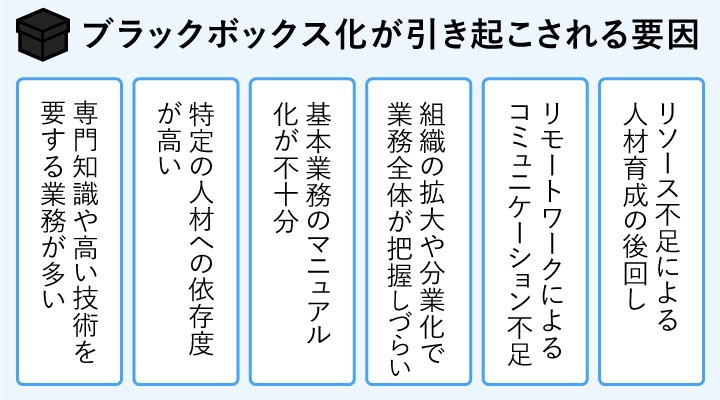 ブラックボックス化は、現場のスキルや組織構造、働き方の変化など、複数の要因が重なって発生します。不透明な業務が生まれる主な背景を解説します。