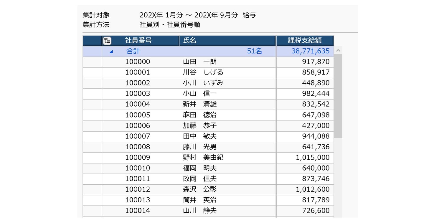 従業員の累計課税支給額は一覧形式で確認でき、年収状況の全体的な把握と管理も容易です。