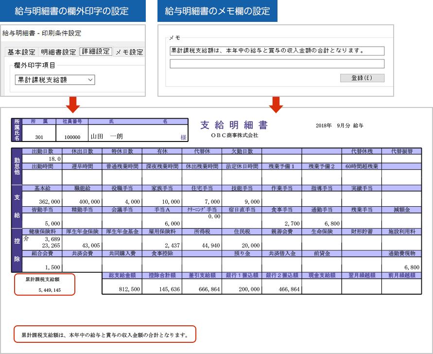 従業員への開示は、給与明細に欄外(左下)に現在給与処理月までの「累計課税支給額」を印字して配付できます。明細書に累計課税支給額を掲載しておけば、年末調整時の従業員からの問い合わせにも時間をかけずに対応できるでしょう。