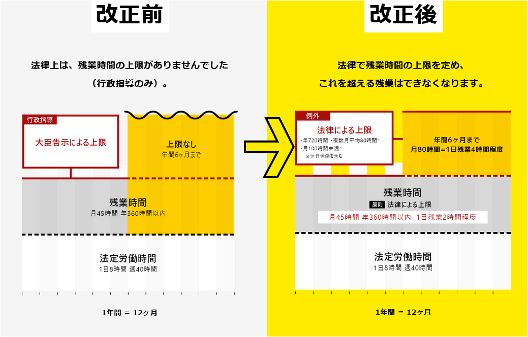2020年以降は中小企業にも時間外労働の上限規制が適用され、現在、一般協定では月45時間・年360時間が、特別条項付き協定でも例外的上限(年720時間・2〜6ヵ月平均80時間・月100時間)※を超えることはできないとされています。
