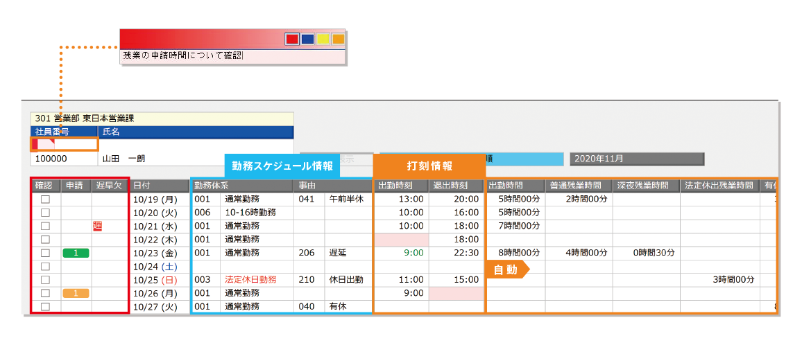 他にも、複数社員や部署を横断して比較し、どの現場で上限超過リスクが高まっているかを、データで“見える化”できるタイプもあります。