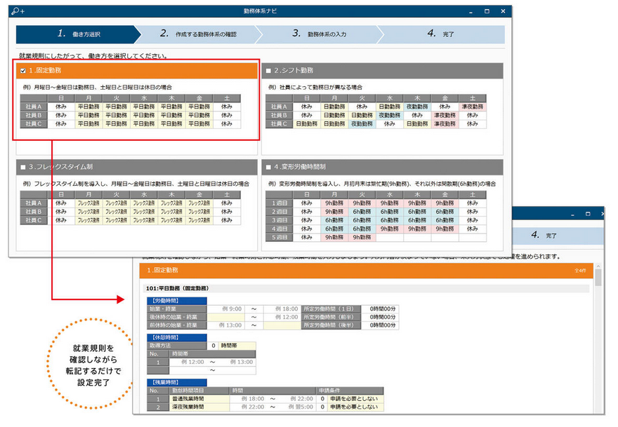 例えば奉行Edge 勤怠管理クラウドでは、ナビの案内に従って設定や入力を進めるだけで、自社の就業規則に則った勤務体系を自由に設定できます。フレックスタイムや変形労働時間制など、通常勤務とは異なる勤務形態にも対応しており、勤怠締めと同時に残業計算も完了するため、 締め日後のExcelによる手集計・手計算が不要になります。
