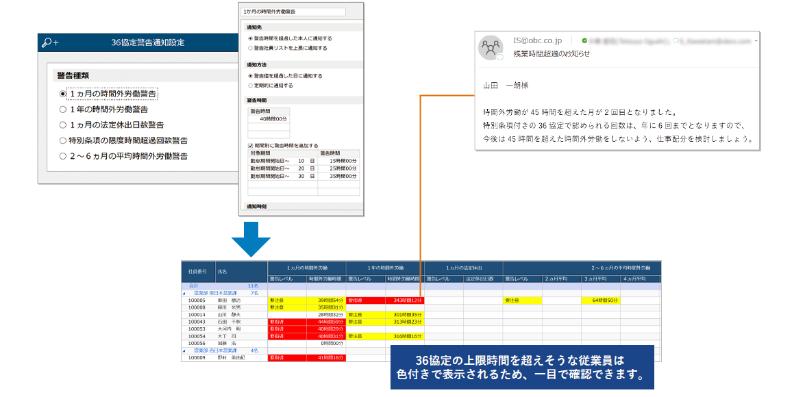 奉行Edge 勤怠管理クラウドの場合は、36協定の届出時間をもとに、1か月・1年間・2〜6か月の平均時間で、時間外・休日労働の進捗を自動監視します。上限を超えそうな従業員は、リストで色付き表示され、基準時間に近づいた段階で本人と上長に自動で通知が送られるため、「気づいたときには超過していた」状況を防ぐことができます。