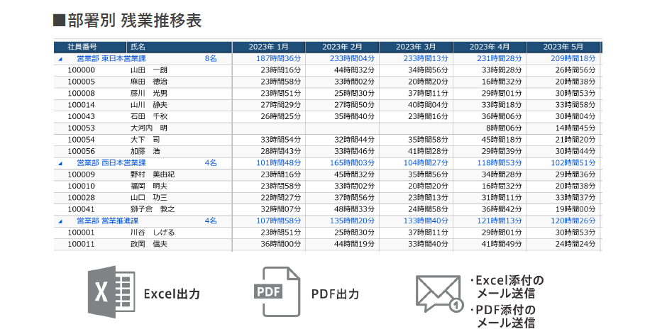 例えば奉行Edge 勤怠管理クラウドでは、月次報告用の集計資料や残業分析用の資料をワンクリックで作成できます。出力された資料は、健康経営やメンタルヘルス対策、部門別の残業分析、生産性指標の算出などに活用できます。