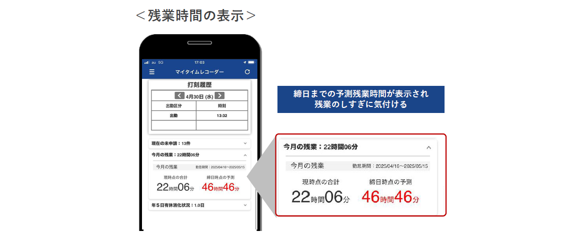 出退勤時刻とPCのログオフ時間の乖離から、サービス残業の有無も確認できるため、テレワークなどの労働状況を可視化し、労働時間の適正把握と長時間労働を防止できます。また、打刻画面に残業時間を表示できるため、従業員側でも残業時間をリアルタイムに確認でき、働きすぎを意識しやすくなることで従業員の意識改革にも役立ちます。