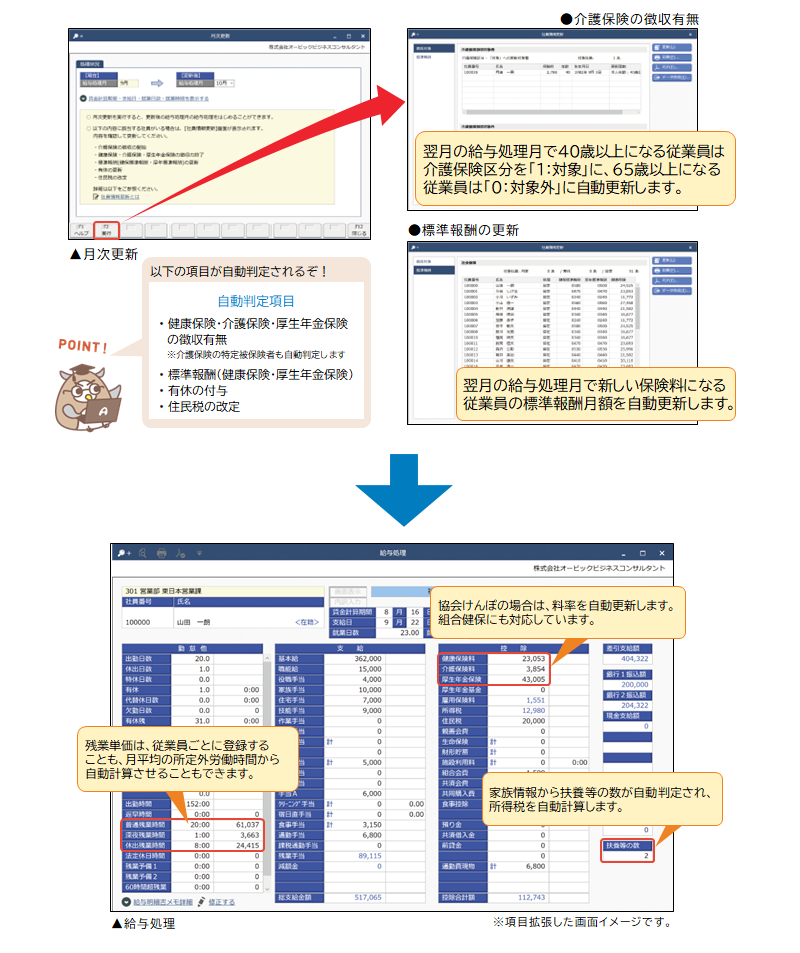 給与奉行iクラウドには、月次更新で給与処理月を翌月にすると、社会保険料の徴収有無が自動判定され社員情報が自動更新されます。その後は、手当や所得税、社内保険料などがすべて自動計算されるため、毎月変動する項目(勤怠実績や当直回数など)を入力するだけで給与処理が完了します。