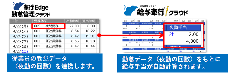 さらに、勤怠データを取り込んで、時短勤務者の勤務実績をもとに基本給・手当・控除も正確に算出できます。勤怠データはボタンひとつでインポートできるため、勤怠項目の入力がなくなり、集計の転記ミスなどもなくなります。奉行Edge 勤怠管理クラウドなら、自動連携されるため集計も勤怠データのインポートも不要です。