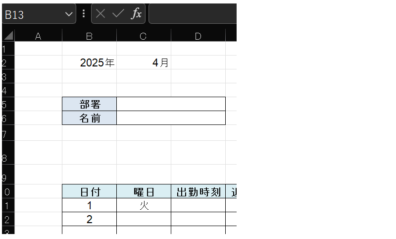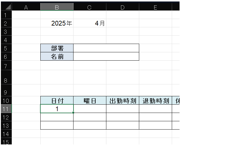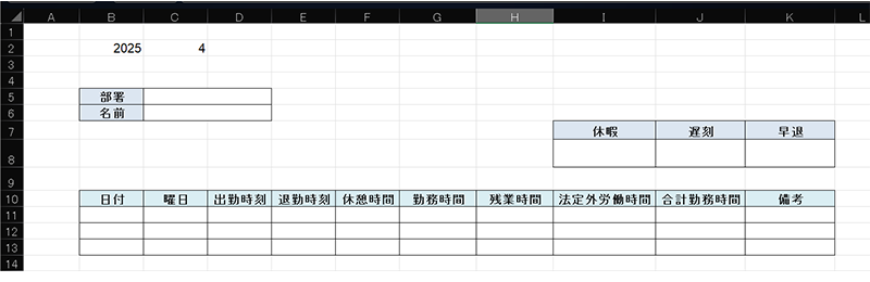 テンプレートとは「ひな形」や「定型書式」という意味であり、あらかじめ整えられた基本形のことです。自社の業務や表記に合わせて調整すれば、そのまま日々の勤怠管理に運用できます。