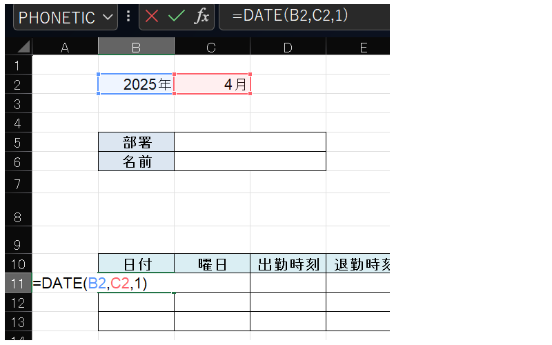 【B11】セルに「=DATE(B2,C2,1)」と入力します。