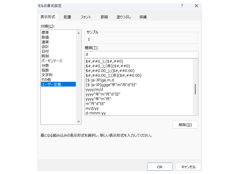 【B11】セルを選択した状態で右クリック→「セルの書式設定」→「表示形式」→「ユーザー定義」を開き、種類を「d」と書き換えたら「OK」を押します。