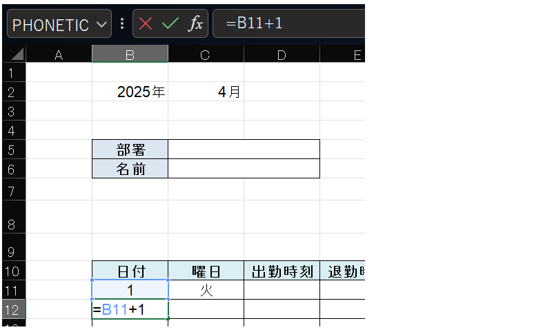 以下のように、2日の日付が入力されました。3日以降については、【B12】を選択し、下にコピーすることで続けて入力できます。