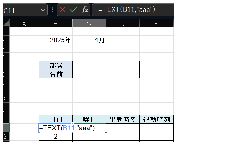 【C11】セルに「=TEXT(B11,”aaa“)」と入力します。