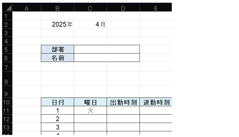 ここでは、エクセルで勤怠管理表を一から作成する手順を画像とともに紹介します。