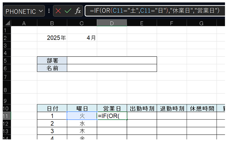 =IF(OR(C11="土",C11="日"),"休業日","営業日")
