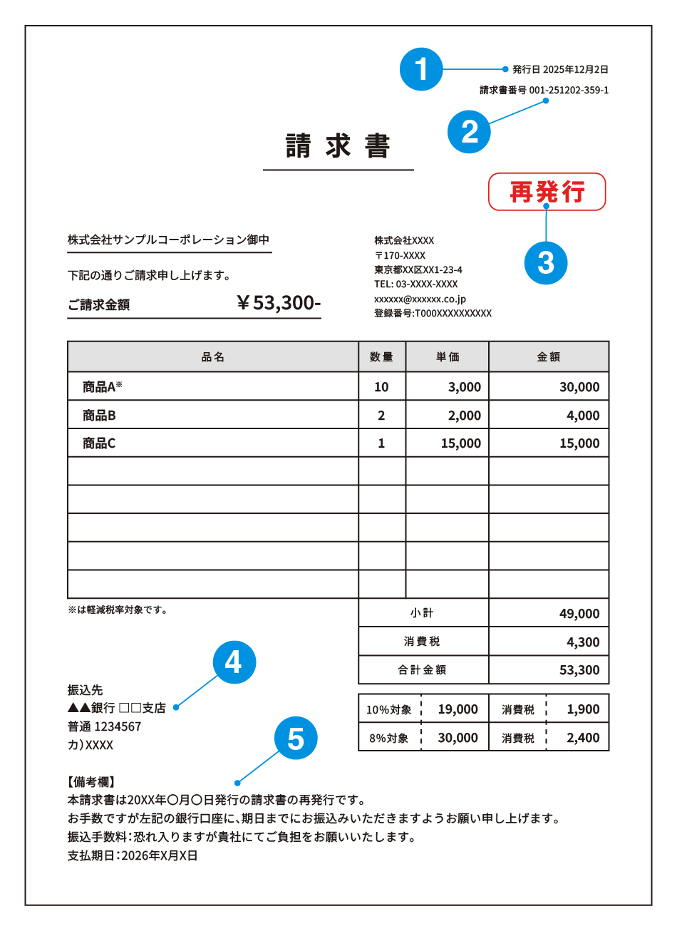 ●請求書の再発行時は当初記載していた日付を記載する