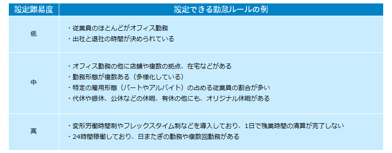 勤怠管理システムの設定難易度は、次のように概ね3段階に分類できます。自社の働き方に合ったシステムの設定レベルを知ることで、自社にとって必要な勤怠管理システムのタイプを絞り込むことができます。