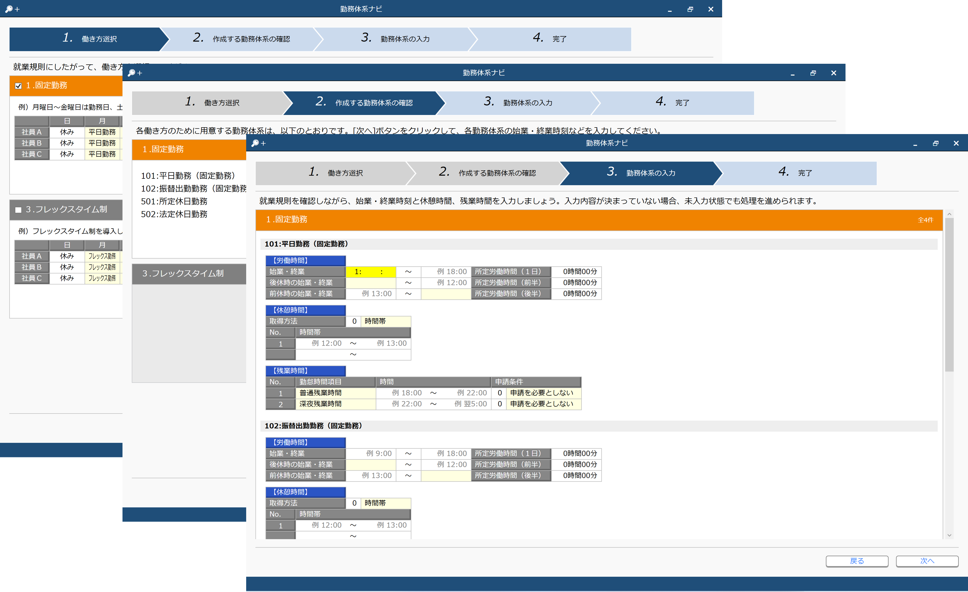 一方で、こうした高度な管理を実現するうえで課題となりやすい「初期設定の負担」を軽減するため、ナビゲーションに沿って設定を進められる仕組みが用意されています。案内に従って入力を進めることで、自社の就業規則に沿った勤務体系を構築できるため、初めての導入でも簡単に自社にあった勤怠管理の仕組みを整えることができます。