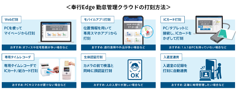 打刻方法も、勤務環境に合わせて選択でき、従業員自身がスマートフォンなどから打刻状況を確認できるため、管理側・従業員側双方の負担軽減にもつながります。