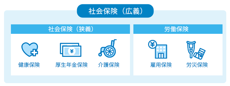 一般に「社会保険」と呼ばれる制度は、健康保険、厚生年金保険、介護保険を指す「社会保険」(狭義)と、雇用保険、労災保険を含む「労働保険」に大別されます。
