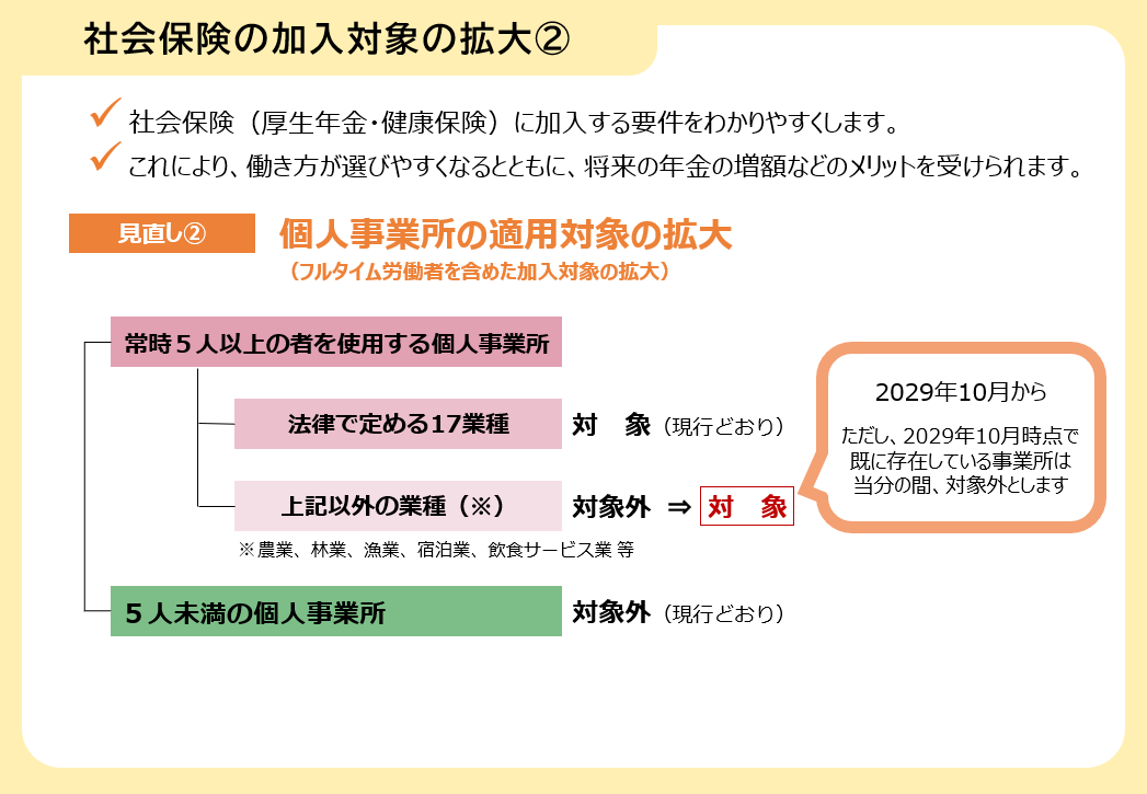 さらに、個人事業所についても適用範囲が見直され、常時5人以上雇用する事業所は業種を問わず適用対象となります。