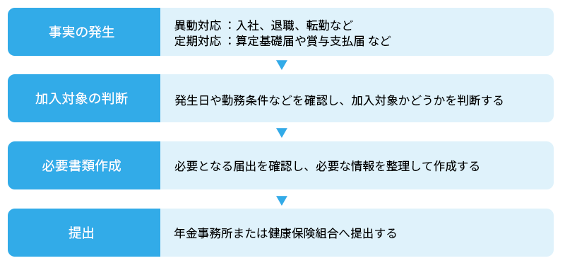 社会保険の手続きは、入社・退職といった異動対応であっても、算定基礎届や賞与支払届のような定期対応であっても、基本的な流れは次のようになります。