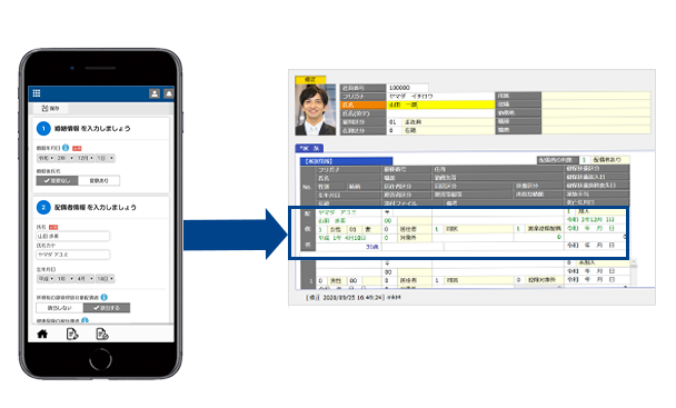 入社予定者にも入社前に情報提出を依頼でき、入社後はこれらの情報をもとに健康保険・厚生年金保険の資格取得届や資格喪失届、扶養控除等(異動)申告書を作成できます。