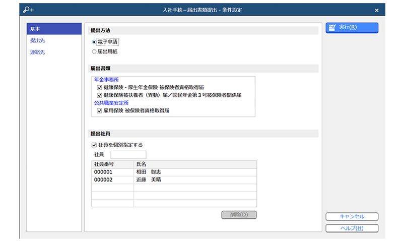 賞与処理の結果をもとに賞与支払届を自動作成でき、磁気媒体での申請用データ作成や電子申請も行えるため、提出期限が短い手続きでも業務の流れの中でスムーズに完了させやすくなります。