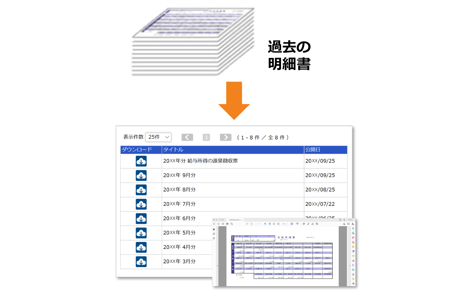 電子給与明細サービスであれば、必要なときに従業員が自ら画面上で過去の明細を確認できます。住宅ローンの手続きや各種申請など、過去の給与明細を求められる場面でも、スムーズに対応しやすくなります。